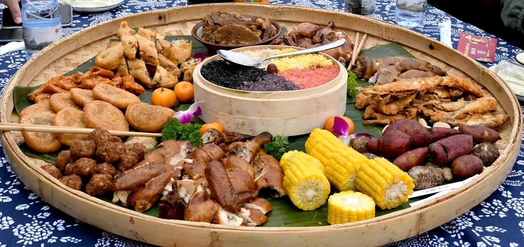 表演過后,為家人精心準備的筵席,在塔山之下、漓江之畔美味開席。鄰里們相對而坐,別具一格的民族美食——簸箕宴擺上餐桌,壯鄉美味五色糯米飯,浸著玫瑰香氣的豉油雞,炸得酥脆的原生態漓江魚,肥而不膩的荔浦芋扣肉.......