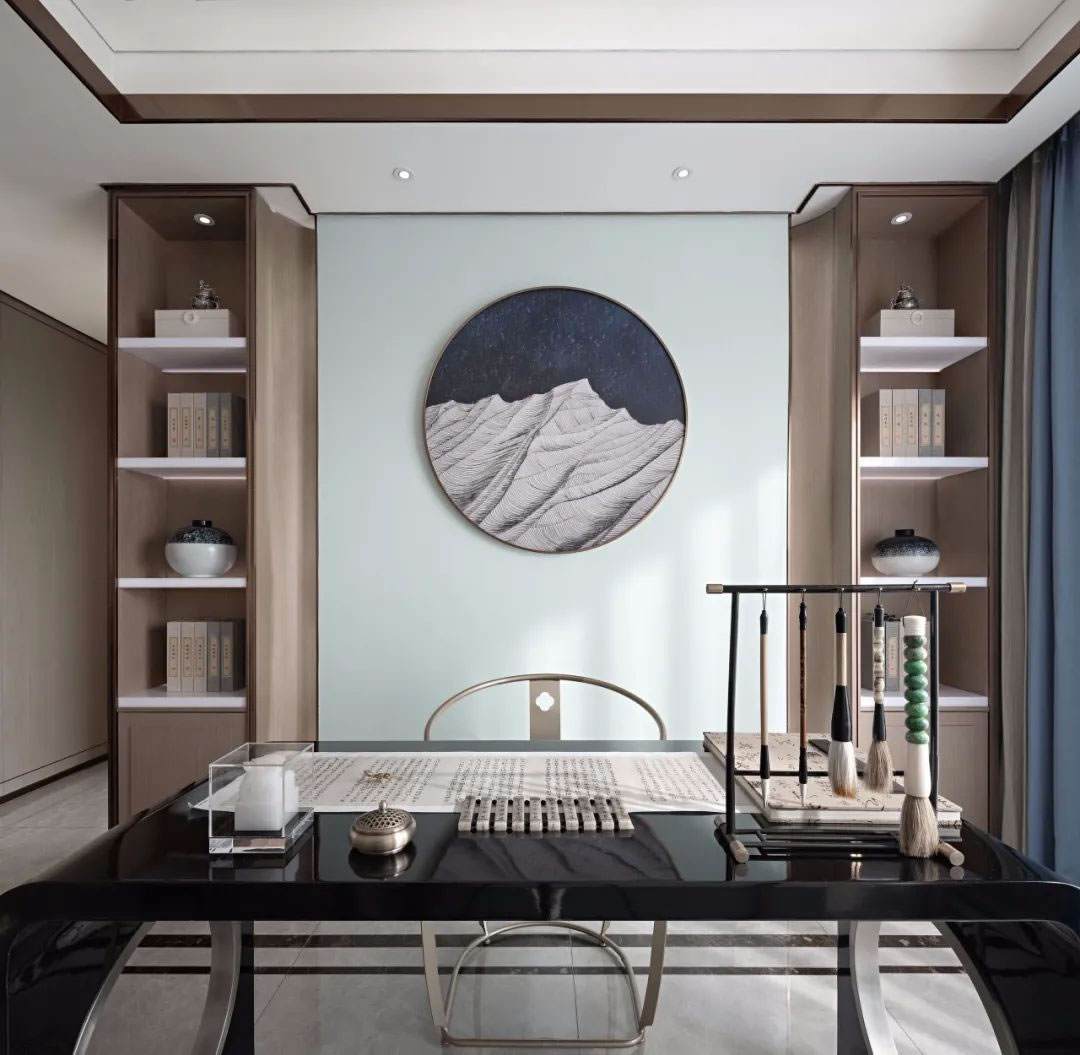 書房丨方與圓的視覺在書房中進行了和諧的配比,儒雅的色彩與木質的純粹,承載著無限的故事和詩意,通透軒敞,節奏利落,光影藝術,讓這里閑坐即擁有云卷云舒的暢意,品茗即享受靜觀風雨的淋漓,靜享花開景明,待看四時光景。