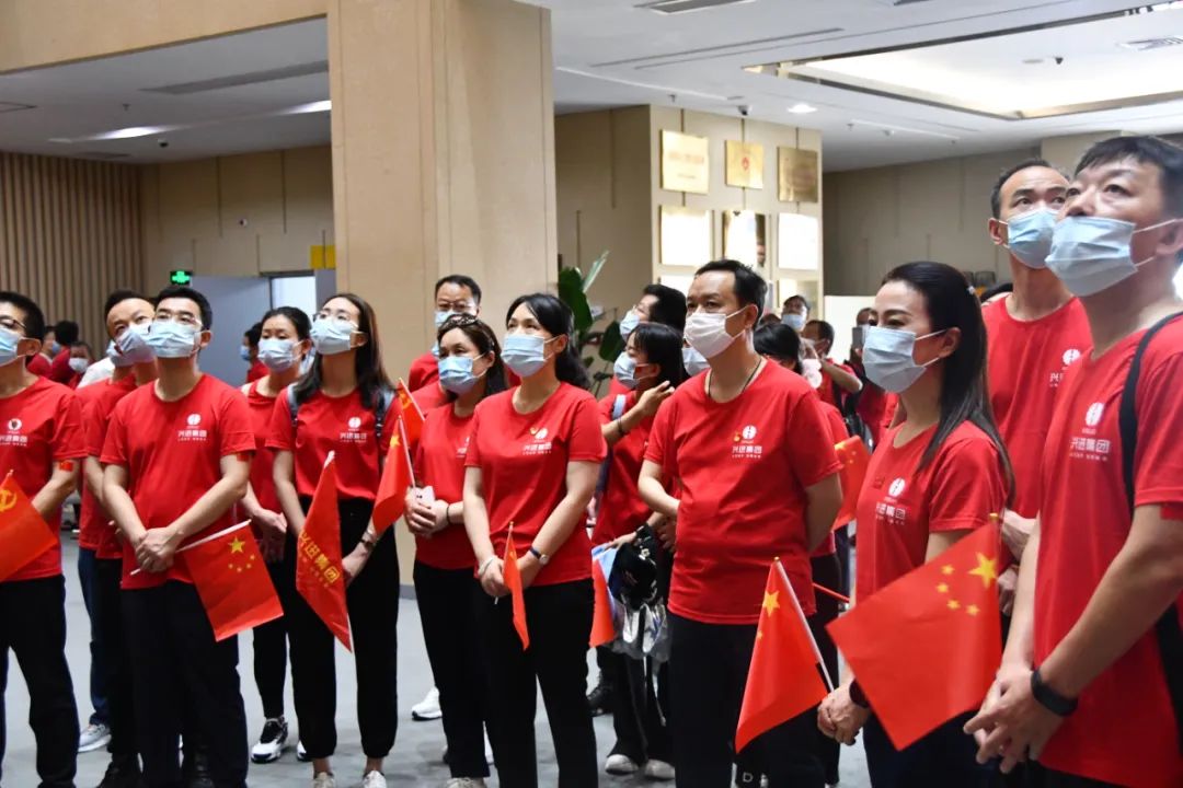 興進(jìn)集團(tuán)黨支部書記羅捷、董事長(zhǎng)羅欣緩步向前整理花籃緞帶,全體成員向革命先烈行三鞠躬禮,深切緬懷革命先烈,表達(dá)內(nèi)心的崇高敬意。在黨支部書記羅捷的帶領(lǐng)下,全體黨員在"紅軍魂"雕塑前,面對(duì)鮮紅的黨旗重溫了入黨誓詞。