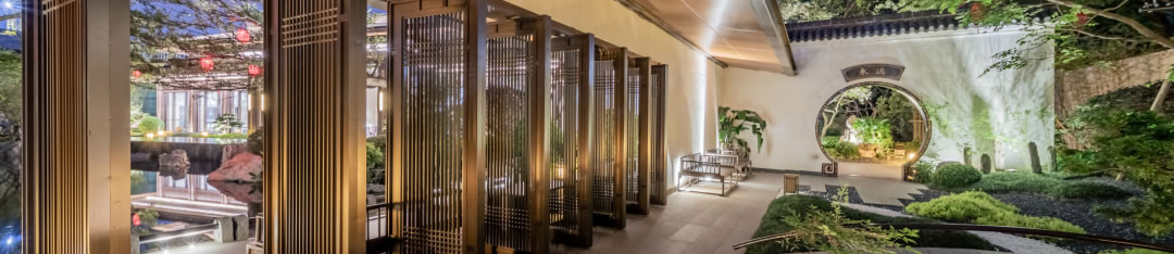 枝干蒼勁、形態(tài)優(yōu)美,壽逾千年的迎客松矗立于庭院各個(gè)角落,亭臺(tái)樓閣章法井然,以奢雅、博雅、清雅為主題打造。