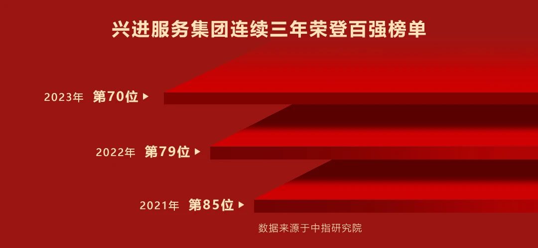 二十二載勵精圖治,興進服務集團憑借在發展規模、服務品質、科技賦能、業主滿意度以及增值服務等多方面的優異指標,榮膺"2023中國物業服務百強企業",第70名。